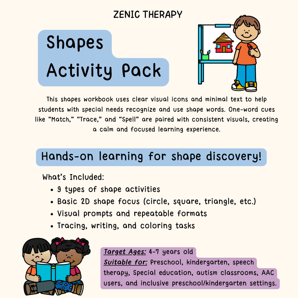 This shapes workbook uses clear visual icons and minimal text to help students with special needs recognize and use shape words. One-word cues like “Match,” “Trace,” and “Spell” are paired with consistent visuals, creating a calm and focused learning experience.